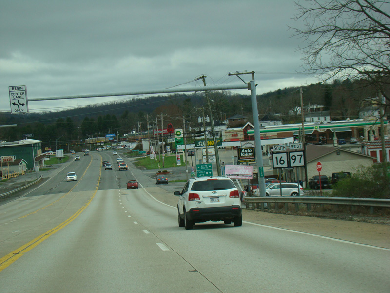 WV 97 begins at the turnpike and is multiplexed with WV 16 along Robert C. Byrd Drive.