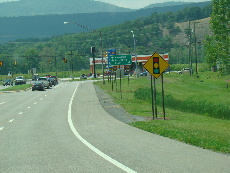 VA 55 becomes WV 55 upon entering West Virginia. It multiplexed with US 48 through Wardensville and along Corridor H to Moorefield, where it splits off.