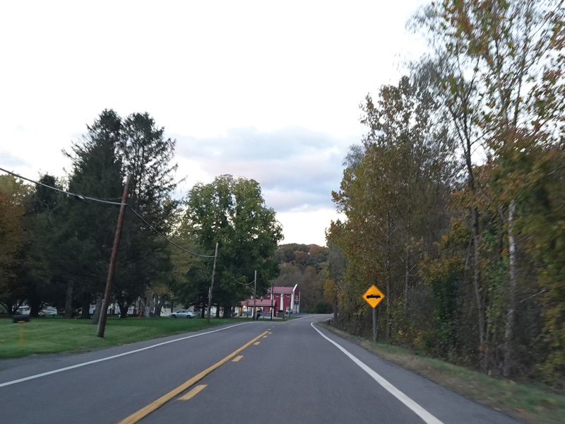 There is a small bridge over New Creek, and then Laurel Dale Road ends at a stop sign at US 50. Merge in straight ahead to go east and to stay on WV 93. Turn left to go west.